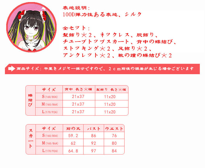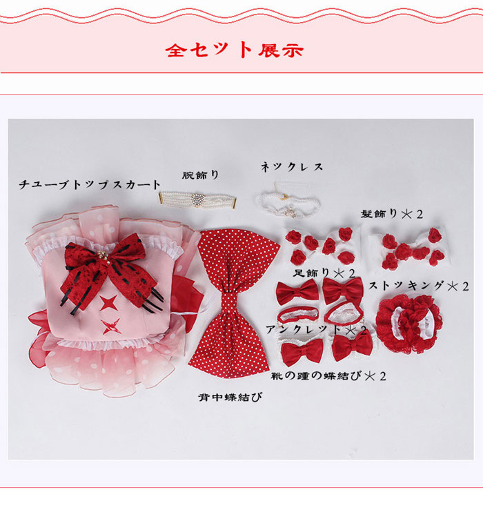 セット内容:ワンピース、手首飾り、ネックレス、髪飾り、足飾り、後リボン、ソックス
