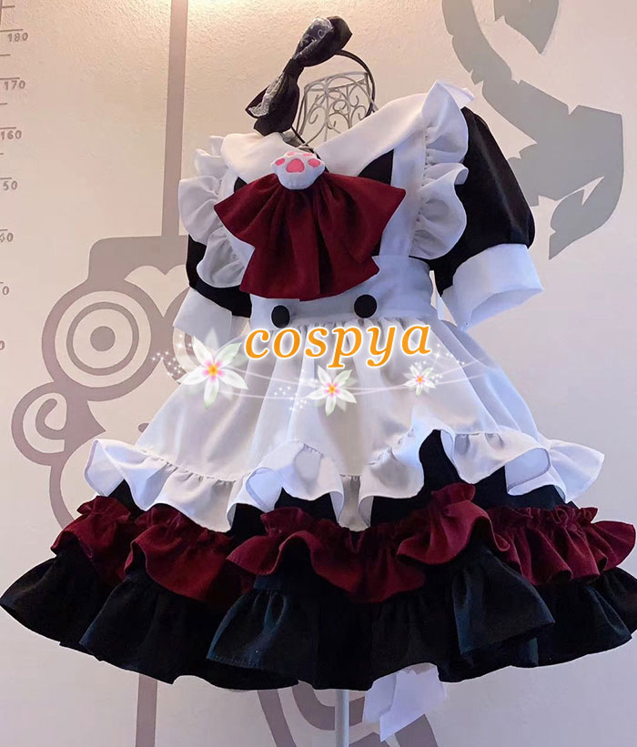 大人気 黒色メイド服 猫手の胸元飾り 荷葉フリル