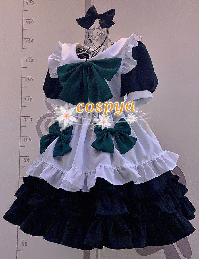 クリスマス.ハロウィン メイド服 ブルーワンピース 丸襟 緑色蝶結び