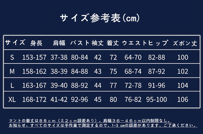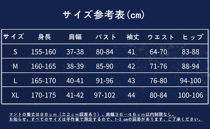 すべてのコスプレ衣装類:製作周期10-12日、出荷時間4-5日なので、ご注文の衣装は15-17日間で到着する可能性があります。出来るだけ早めに衣装を仕上げるために、ご発注後、メールで当方をご連絡ください、お客様の身長、体重、肩幅、バスト、ウエスト、ヒップの具体サイズをご提供くださるようお願い申し上げます。 以上、よろしくお願い申し上げます。