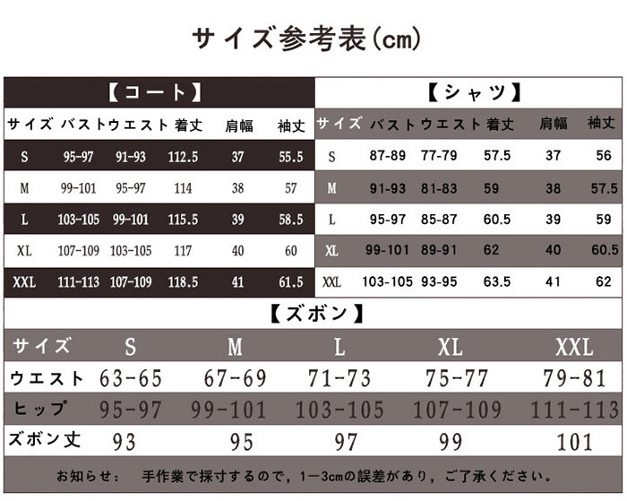 すべてのコスプレ衣装類:製作周期10-12日、出荷時間4-5日なので、ご注文の衣装は15-17日間で到着する可能性があります。出来るだけ早めに衣装を仕上げるために、ご発注後、メールで当方をご連絡ください、お客様の身長、体重、肩幅、バスト、ウエスト、ヒップの具体サイズをご提供くださるようお願い申し上げます。 以上、よろしくお願い申し上げます。