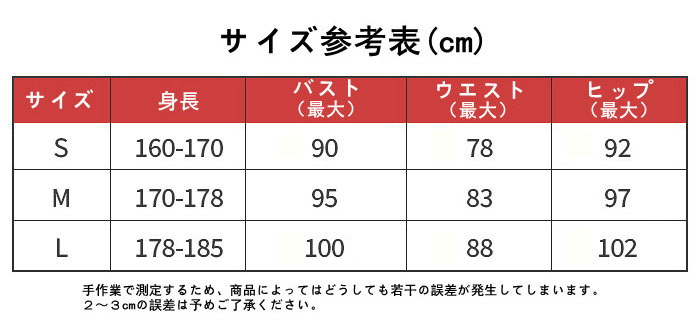質感がとてもいい本日(5月3日)衣装が届きました。 購入した際(3月29日)、入金確認メールを送信後に、人気商品のため配送が遅れてしまうと前もってメールでご連絡いただいていたのですが、納期を急いでいなかったため気長に待っていました。 早ければ4月末頃にお届けできますとのことだったので、日付が近づいてから再度確認のメールを送らさせていただいたのですが、丁寧な返答と配送状況がわかるように中国EMSの追跡番号を送ってくださいました。 実際の衣装のレビューです↓ (当方の体型は、 身長:157cm 肩幅:38cm 胸囲:78cm 腹囲:64cm です。) Sサイズを購入したのですが、緩い場所やきつい場所もなく、ぴったりときることができました。 着脱は首の左右、腰から背中にかけての計3箇所で、ファスナーです。 布の質感はサンプルの写真そのままで、スエード?を使用しているようでした。 スカートの長さを心配していたのですが、お尻が見えることも長すぎることもない適度な長さでとても良いと思います。 付属品は、カチューシャ、アイマスク、手袋、サイハイストッキングがついています。 アイマスクも衣装と同じ生地で製作されており、ゴムでの固定式だったので装着がとても楽です。 手袋は仕様が少し変わったのか、サンプルで銀色だった部分が白で製作されていましたが、問題ないと思います。 とても良い商品だと思います! 他の作品の衣装でも機会があれば是非リピートさせていただきたいとおもっています、有難う御座いました。にあ