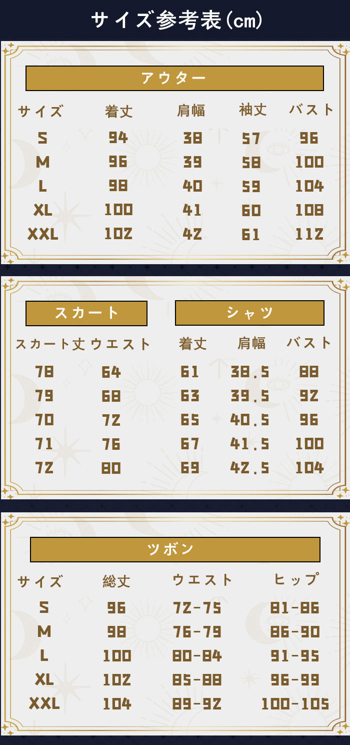すべてのコスプレ衣装類:製作周期10-12日、出荷時間4-5日なので、ご注文の衣装は15-17日間で到着する可能性があります。出来るだけ早めに衣装を仕上げるために、ご発注後、メールで当方をご連絡ください、お客様の身長、体重、肩幅、バスト、ウエスト、ヒップの具体サイズをご提供くださるようお願い申し上げます。 以上、よろしくお願い申し上げます。