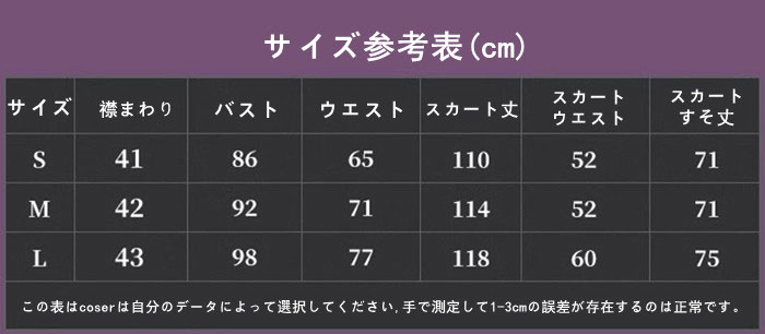 すべてのコスプレ衣装類:製作周期10-12日、出荷時間4-5日なので、ご注文の衣装は15-17日間で到着する可能性があります。出来るだけ早めに衣装を仕上げるために、ご発注後、メールで当方をご連絡ください、お客様の身長、体重、肩幅、バスト、ウエスト、ヒップの具体サイズをご提供くださるようお願い申し上げます。 以上、よろしくお願い申し上げます。