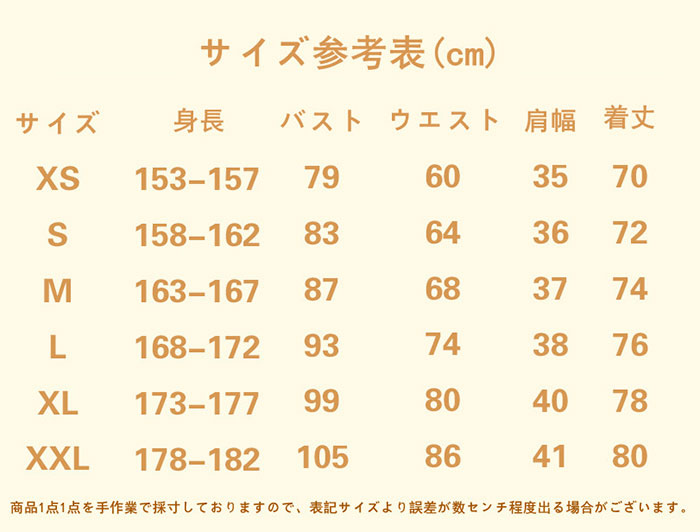 すべてのコスプレ衣装類:製作周期10-12日、出荷時間4-5日なので、ご注文の衣装は15-17日間で到着する可能性があります。出来るだけ早めに衣装を仕上げるために、ご発注後、メールで当方をご連絡ください、お客様の身長、体重、肩幅、バスト、ウエスト、ヒップの具体サイズをご提供くださるようお願い申し上げます。 以上、よろしくお願い申し上げます。
