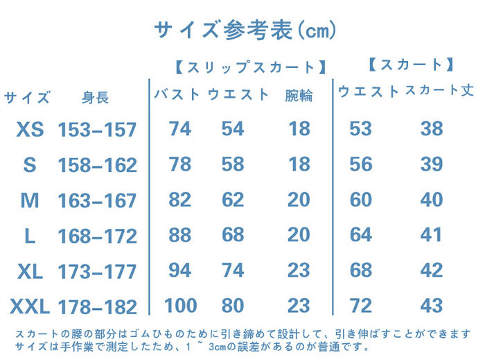 質感がとてもいい本日(5月3日)衣装が届きました。 購入した際(3月29日)、入金確認メールを送信後に、人気商品のため配送が遅れてしまうと前もってメールでご連絡いただいていたのですが、納期を急いでいなかったため気長に待っていました。 早ければ4月末頃にお届けできますとのことだったので、日付が近づいてから再度確認のメールを送らさせていただいたのですが、丁寧な返答と配送状況がわかるように中国EMSの追跡番号を送ってくださいました。 実際の衣装のレビューです↓ (当方の体型は、 身長:157cm 肩幅:38cm 胸囲:78cm 腹囲:64cm です。) Sサイズを購入したのですが、緩い場所やきつい場所もなく、ぴったりときることができました。 着脱は首の左右、腰から背中にかけての計3箇所で、ファスナーです。 布の質感はサンプルの写真そのままで、スエード?を使用しているようでした。 スカートの長さを心配していたのですが、お尻が見えることも長すぎることもない適度な長さでとても良いと思います。 付属品は、カチューシャ、アイマスク、手袋、サイハイストッキングがついています。 アイマスクも衣装と同じ生地で製作されており、ゴムでの固定式だったので装着がとても楽です。 手袋は仕様が少し変わったのか、サンプルで銀色だった部分が白で製作されていましたが、問題ないと思います。 とても良い商品だと思います! 他の作品の衣装でも機会があれば是非リピートさせていただきたいとおもっています、有難う御座いました。にあ