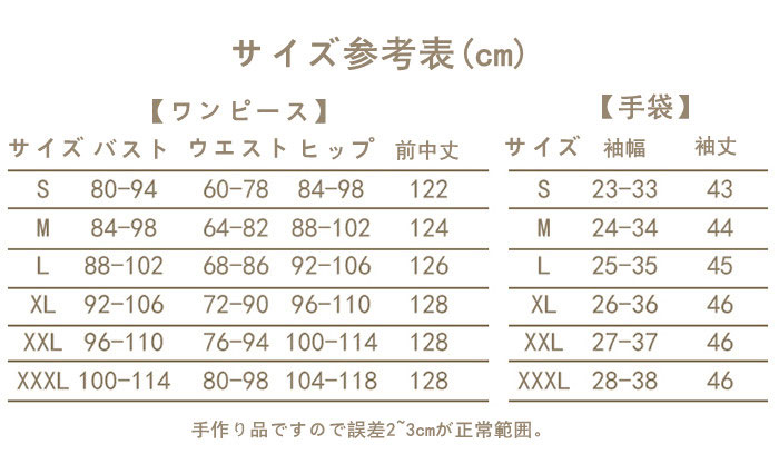 質感がとてもいい本日(5月3日)衣装が届きました。 購入した際(3月29日)、入金確認メールを送信後に、人気商品のため配送が遅れてしまうと前もってメールでご連絡いただいていたのですが、納期を急いでいなかったため気長に待っていました。 早ければ4月末頃にお届けできますとのことだったので、日付が近づいてから再度確認のメールを送らさせていただいたのですが、丁寧な返答と配送状況がわかるように中国EMSの追跡番号を送ってくださいました。 実際の衣装のレビューです↓ (当方の体型は、 身長:157cm 肩幅:38cm 胸囲:78cm 腹囲:64cm です。) Sサイズを購入したのですが、緩い場所やきつい場所もなく、ぴったりときることができました。 着脱は首の左右、腰から背中にかけての計3箇所で、ファスナーです。 布の質感はサンプルの写真そのままで、スエード?を使用しているようでした。 スカートの長さを心配していたのですが、お尻が見えることも長すぎることもない適度な長さでとても良いと思います。 付属品は、カチューシャ、アイマスク、手袋、サイハイストッキングがついています。 アイマスクも衣装と同じ生地で製作されており、ゴムでの固定式だったので装着がとても楽です。 手袋は仕様が少し変わったのか、サンプルで銀色だった部分が白で製作されていましたが、問題ないと思います。 とても良い商品だと思います! 他の作品の衣装でも機会があれば是非リピートさせていただきたいとおもっています、有難う御座いました。にあ