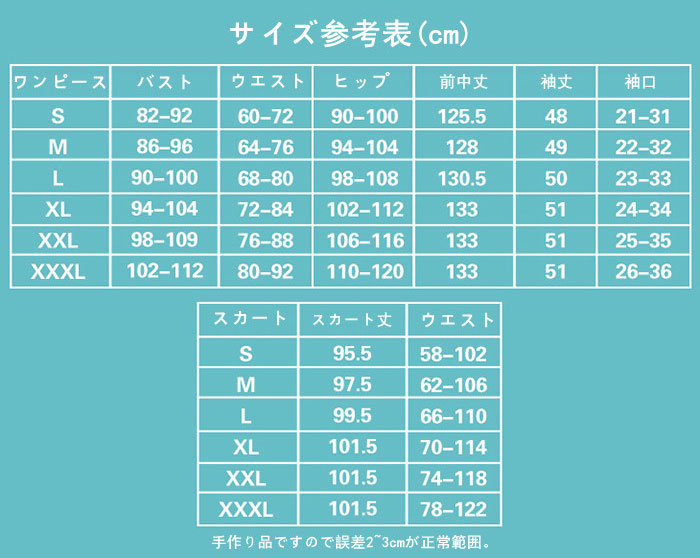 初めての利用でした初めてこのサイト様を利用しました。 当初併せの予定が早まり、ご連絡しましたところ 手配を早めて頂き 予定より一週間早くに配送して下さいました。 商品も布や作り等、欠品なども問題なかったです。 Sサイズを注文しましたが、スカート丈が少し長く 全体的にも若干大きめに作られていると感じました。 また利用したいと思います。 ありがとうございました。翼
