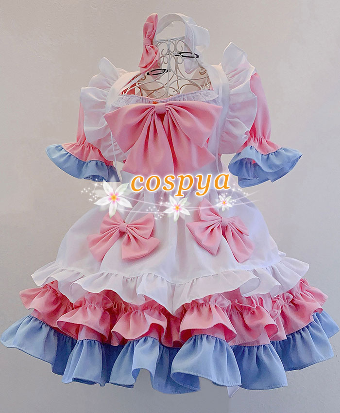 メイド服 オーダーメイド 荷葉フリル 萌え萌え コスチューム ブルーピンク 大きなリボン