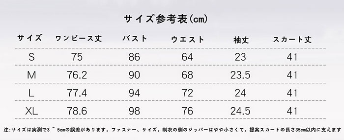 質感がとてもいい本日(5月3日)衣装が届きました。 購入した際(3月29日)、入金確認メールを送信後に、人気商品のため配送が遅れてしまうと前もってメールでご連絡いただいていたのですが、納期を急いでいなかったため気長に待っていました。 早ければ4月末頃にお届けできますとのことだったので、日付が近づいてから再度確認のメールを送らさせていただいたのですが、丁寧な返答と配送状況がわかるように中国EMSの追跡番号を送ってくださいました。 実際の衣装のレビューです↓ (当方の体型は、 身長:157cm 肩幅:38cm 胸囲:78cm 腹囲:64cm です。) Sサイズを購入したのですが、緩い場所やきつい場所もなく、ぴったりときることができました。 着脱は首の左右、腰から背中にかけての計3箇所で、ファスナーです。 布の質感はサンプルの写真そのままで、スエード?を使用しているようでした。 スカートの長さを心配していたのですが、お尻が見えることも長すぎることもない適度な長さでとても良いと思います。 付属品は、カチューシャ、アイマスク、手袋、サイハイストッキングがついています。 アイマスクも衣装と同じ生地で製作されており、ゴムでの固定式だったので装着がとても楽です。 手袋は仕様が少し変わったのか、サンプルで銀色だった部分が白で製作されていましたが、問題ないと思います。 とても良い商品だと思います! 他の作品の衣装でも機会があれば是非リピートさせていただきたいとおもっています、有難う御座いました。にあ