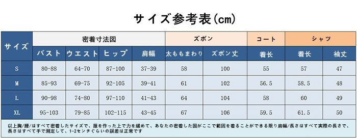 身長、体重、肩幅、スリーサイズの具体サイズをご明記ください